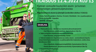 Kymenlaakson Jäte Oy järjestää MARKKINAVUOROPUHELUTILAISUUS 12.4.2022 klo 13.00 – 14.30– Kunnan vastuulle kuuluvien asuin- ja kunnan kiinteistöjen jätteenkuljetuksista Tilaisuus on tarkoitettu kuljetuspalveluja tarjoaville yrityksille. Tilaisuudessa esitellään tulossa olevia jätteenkuljetusten kilpailutuksia, kerrotaan yrittäjien mahdollisuuksista saada tukea kilpailutuksiin osallistumisessa, keskustellaan mahdollisten tarjoajien kanssa ja vastataan kysymyksiin. Kilpailutettavat alueet ja jätelajit (urakoiden aloitus 7/2023):• Kotka, Pyhtää, Lapinjärvi, Hamina, …